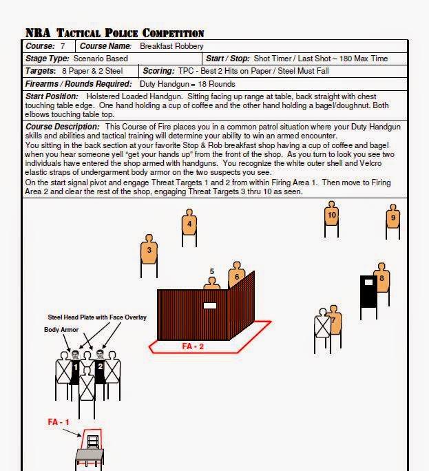 In the next exercise, Officer Friendly is answering a burglar alarm when he spots four perps exiting the building one of whom "draws a gun from his waist" (the way they always do) and "begins" to "point it" at Brave Officer Friendly (the way they are so often said to do, even when unarmed). At the tone, Officer Friendly is to commence firing, dispatching Threats 1-4 before entering the building and dispatching all the subsequent Threats (5-16) bam, bam, bam.